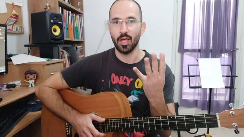 ארבעת האצבעות כבר מונחות על הצוואר של הגיטרה, ונתחיל להעביר את האצבעות אחת אחת למיתר הבא, מיתר 5.